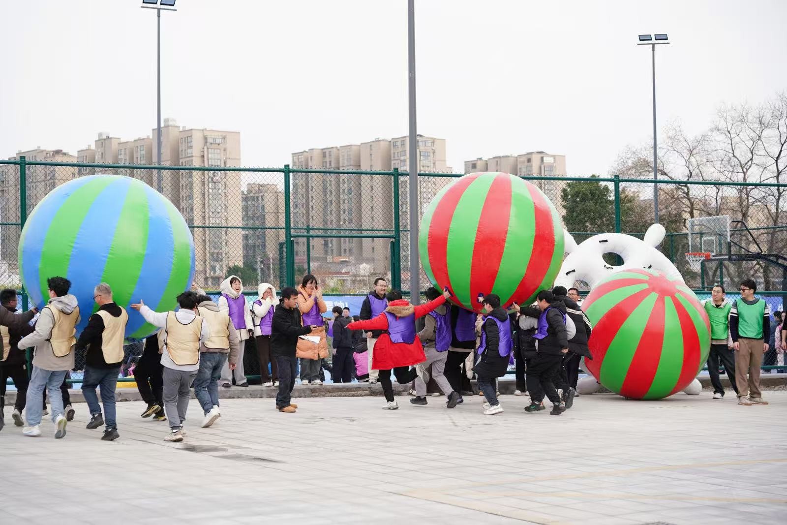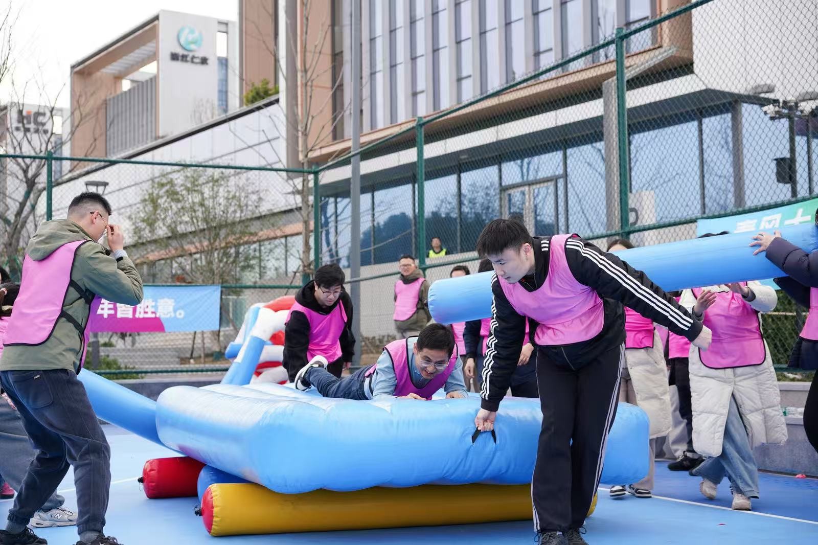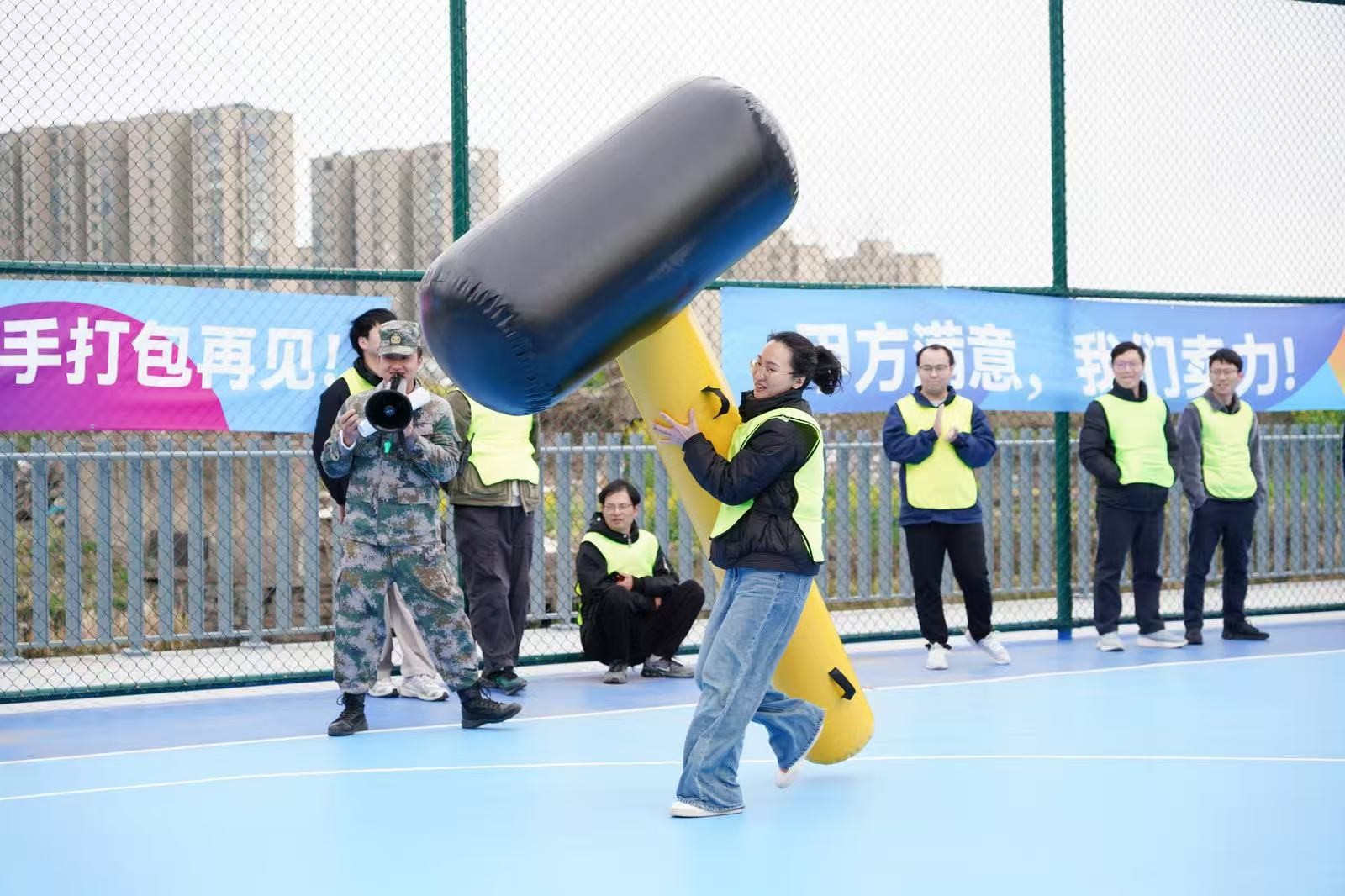 “勇立潮頭”考驗的是反應與穩(wěn)定,隊員們圍成圓圈快速移動,同步接住充氣柱,1分鐘內(nèi)有效移動次數(shù)不斷刷新。“超級NBA”中,大家用瑜伽球投籃,雖姿勢各異,但進球瞬間的歡呼同樣熱烈。“乘風破浪”要求隊員在充氣墊上接力鋪設(shè)充氣棒,讓體重不輕于75kg的“重量級”選手穩(wěn)坐墊上,隊友們默契配合,如乘風破浪般前行。最后的“巨人腳步”由每隊兩名領(lǐng)隊腳穿巨型鞋蹼接力奔跑,滑稽的動作引來全場笑聲不斷。