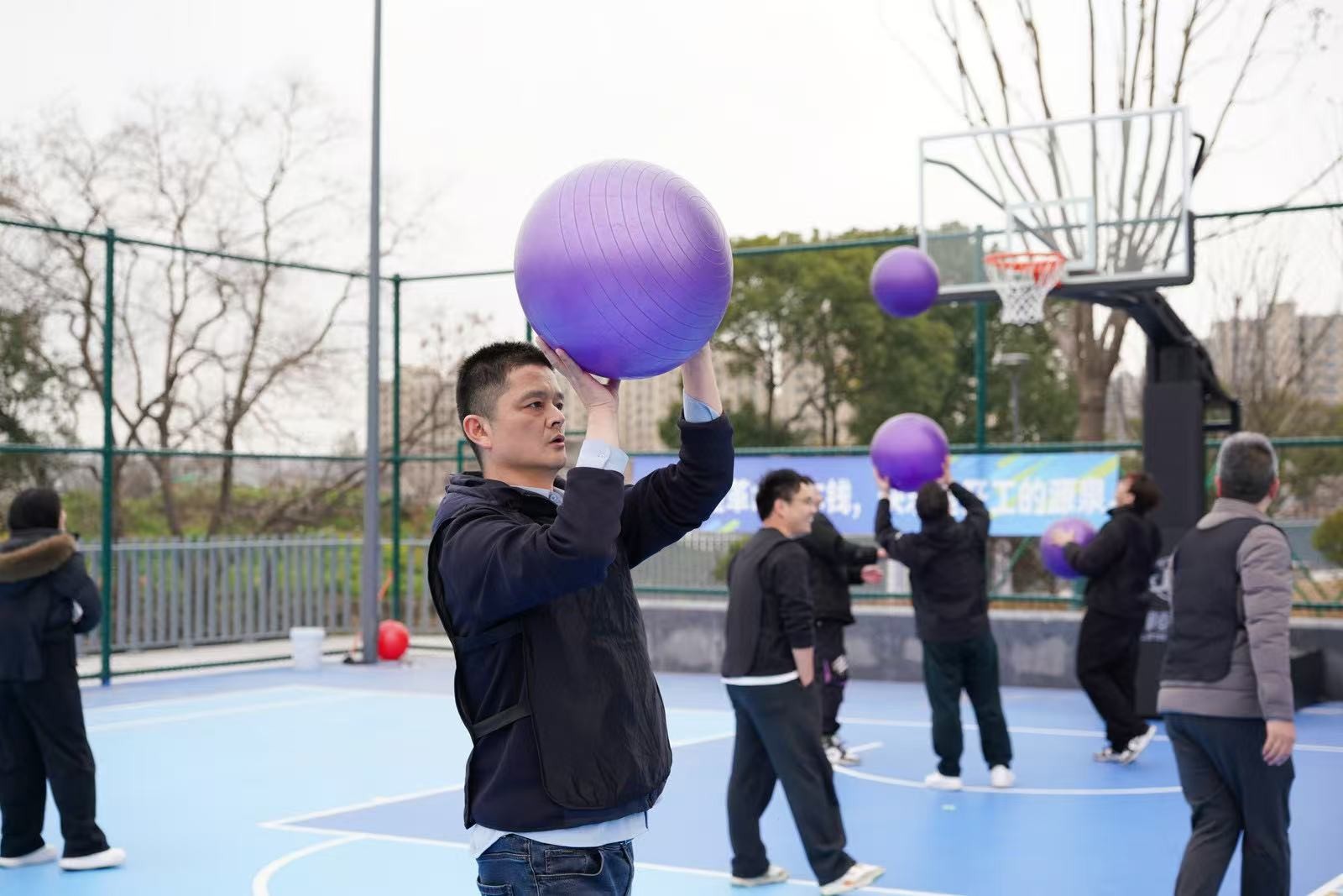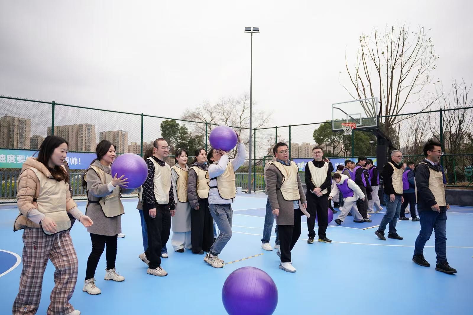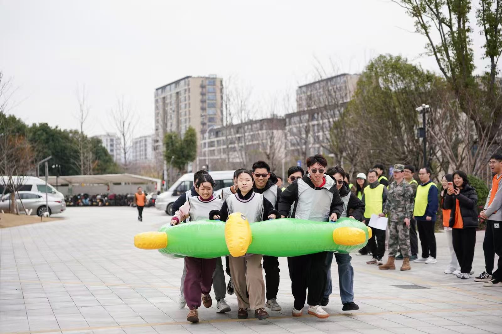 “勇立潮頭”考驗的是反應與穩(wěn)定,隊員們圍成圓圈快速移動,同步接住充氣柱,1分鐘內(nèi)有效移動次數(shù)不斷刷新。“超級NBA”中,大家用瑜伽球投籃,雖姿勢各異,但進球瞬間的歡呼同樣熱烈。“乘風破浪”要求隊員在充氣墊上接力鋪設(shè)充氣棒,讓體重不輕于75kg的“重量級”選手穩(wěn)坐墊上,隊友們默契配合,如乘風破浪般前行。最后的“巨人腳步”由每隊兩名領(lǐng)隊腳穿巨型鞋蹼接力奔跑,滑稽的動作引來全場笑聲不斷。