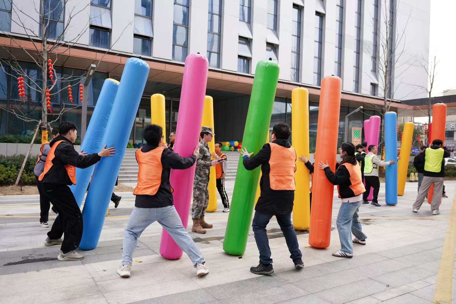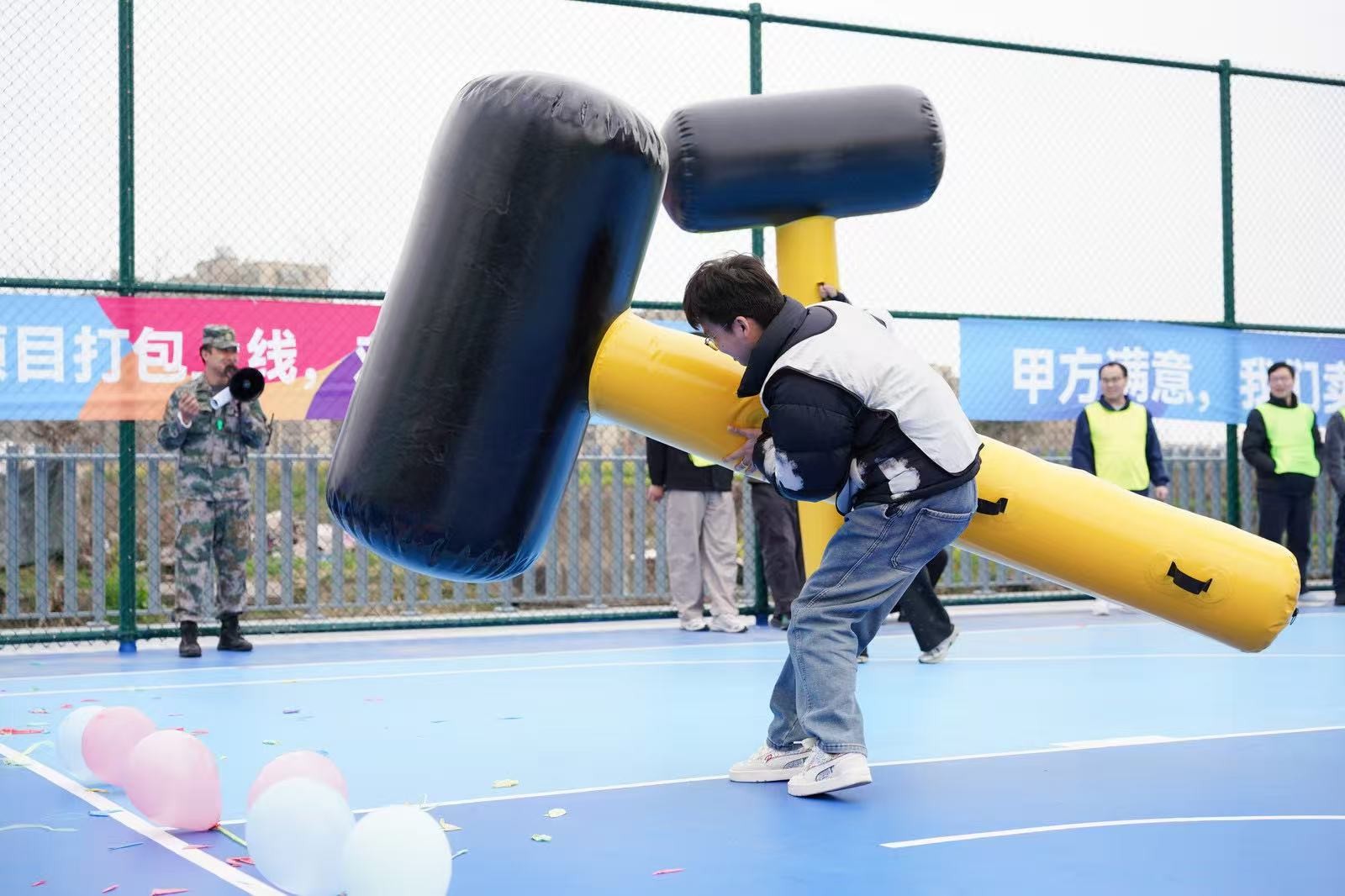 在“南水北調(diào)”項目中,隊員們手持PVC管接力運水,5分鐘內(nèi)爭分奪秒,讓水流在管中傳遞涌向重點,仿佛將團隊的信任與責任匯聚成河。“龜兔賽跑”則讓隊員們化身可愛的“烏龜”和“兔子”,在賽道上你追我趕,妙趣橫生。“鴻運亨通”需要8人共同托舉大球折返跑,大家步調(diào)一致,齊頭并進。“一錘定音”環(huán)節(jié),隊員們揮動充氣大錘敲破氣球,每一聲“砰”響都引來陣陣喝彩。