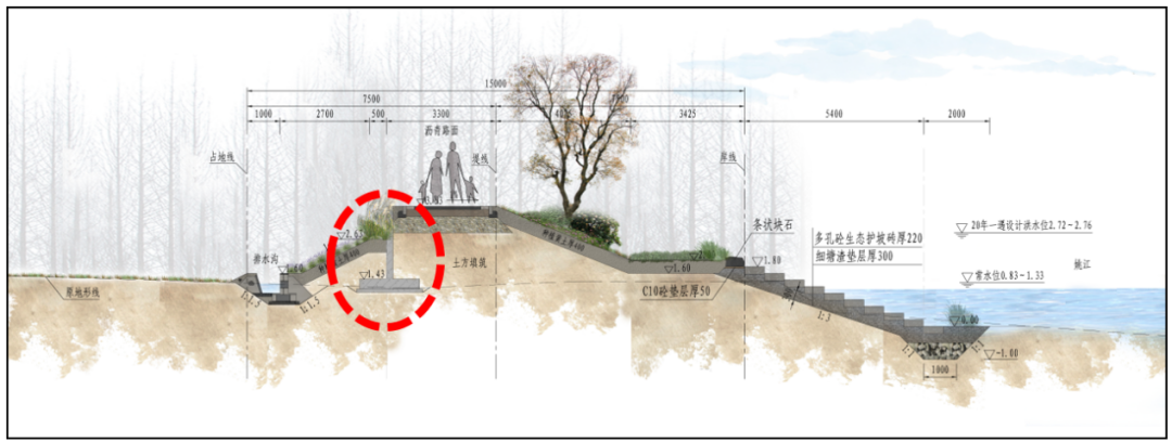為了保證水體交換同時(shí)防御土體掏刷,工程迎水側(cè)護(hù)坡采用多孔混凝土生態(tài)護(hù)坡磚,不僅防沖固土,也利于水生動(dòng)植物生長(zhǎng),營(yíng)造自然、生態(tài)的水岸環(huán)境。